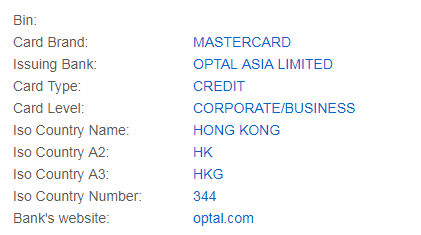 - 发卡公司/发卡行:OPTAL ASIA LIMITED